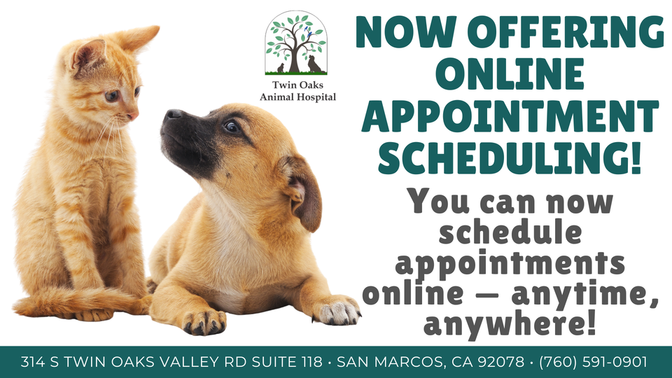 Twin Oaks Animal Hospital is located in San Marcos, CA. We have been providing quality, personalized care for your best friends since we opened in 2013. For more information about our hospital or services, please feel free to browse our website, or call and speak with our friendly team members at (760) 591-0901.
